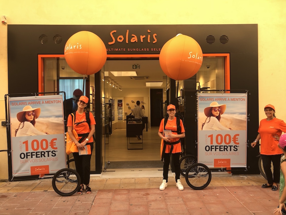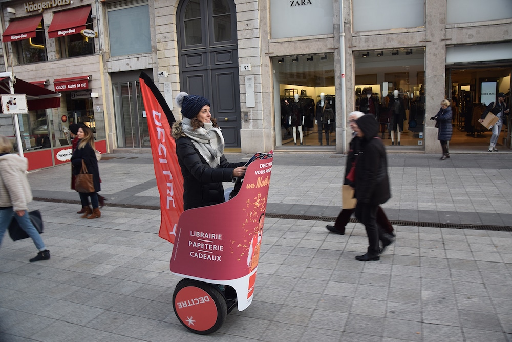 Oui, c’est vrai que l’on parle beaucoup de Segway. Mais ce mode de déplacement doux est un excellent moyen pour vos campagnes de street marketing ! C’est par exemple le choix qu’à fait la marque Decitre en 2019 en créant une campagne terrain avec 2 gyropodes Segway complètement équipés. Du carénage central, au covering des roues ainsi qu’à l’oriflamme. Ces gyropodes, dont le code de la route autorise la circulation sur les voies cyclables et les places publiques, suscitent la curiosité des passants. Ils permettent un affichage mobile complet. Et puis, c’est un excellent moyen de se démarquer de la concurrence !